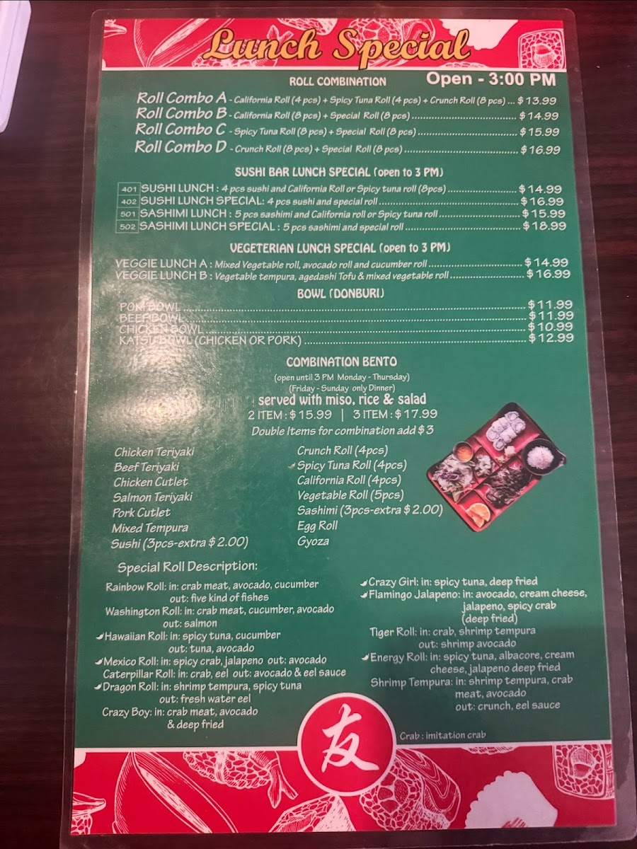 The lunch menu highlights include the Philadelphia Roll with its creamy blend of cream cheese and salmon, as well as the Kamikaze Roll, a thrilling spicy tuna option. For those who crave the crunch of tempura, the Crazy Girl Roll delivers flavor packed with deep-fried bliss. Meanwhile, the skillfully crafted ceviche roll shines with fresh salmon accented by thin slices of lemon.
